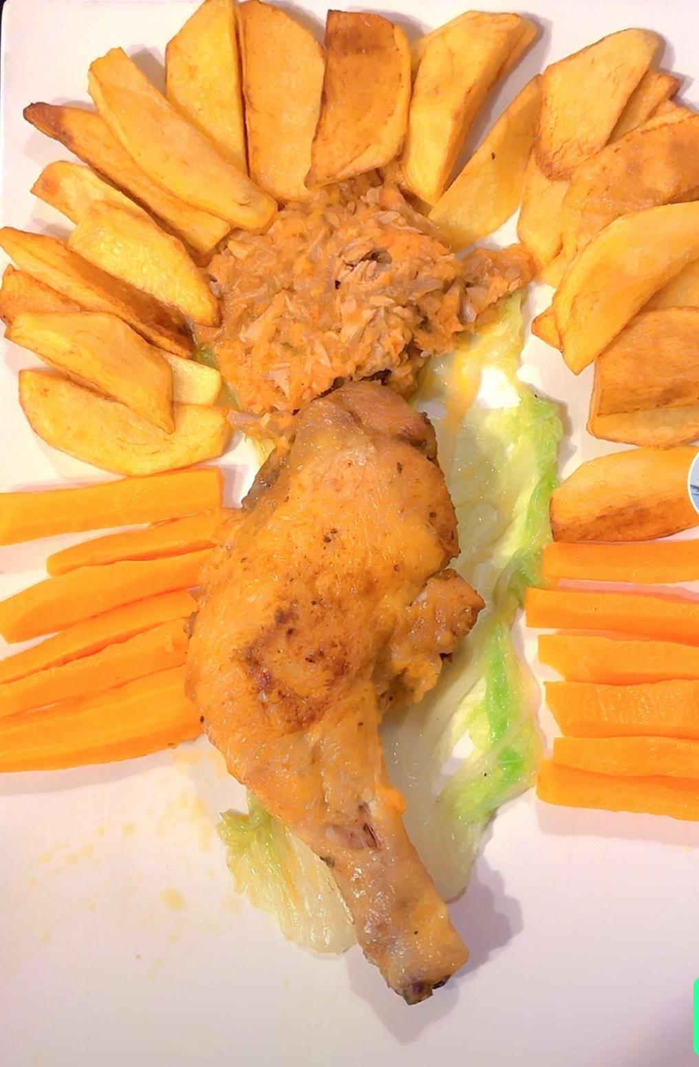 Cuisse de poulet en sauce sur son lit de salade, carottes et potatoes